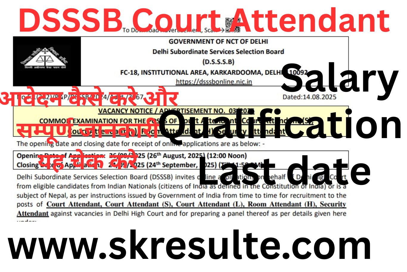 दिल्ली अधीनस्थ सेवा चयन बोर्ड (DSSSB) ने वर्ष 2025 में Court Attendant, Court Attendant (S), Court Attendant (L), Room Attendant (H) और Security Attendant के कुल 334 पदों पर भर्ती परीक्षा आयोजित करने की घोषणा की है। यह भर्ती उन अभ्यर्थियों के लिए एक सुनहरा अवसर है, जो दिल्ली सरकार के विभिन्न विभागों में स्थायी नौकरी पाना चाहते हैं। इस परीक्षा के लिए न्यूनतम शैक्षणिक योग्यता 10वीं/12वीं पास निर्धारित की गई है तथा आयु सीमा 18 से 27 वर्ष रखी गई है, जिसमें आरक्षित वर्गों को नियमानुसार छूट प्रदान की जाएगी। उम्मीदवार 26 अगस्त 2025 से 24 सितम्बर 2025 तक ऑनलाइन आवेदन कर सकते हैं। आवेदन प्रक्रिया DSSSB की आधिकारिक वेबसाइट dsssb.delhi.gov.in पर पूरी की जाएगी। इस भर्ती से संबंधित विस्तृत जानकारी जैसे सिलेबस, परीक्षा पैटर्न, पात्रता मानदंड, वेतनमान और तैयारी के टिप्स इस आर्टिकल में विस्तार से उपलब्ध है।