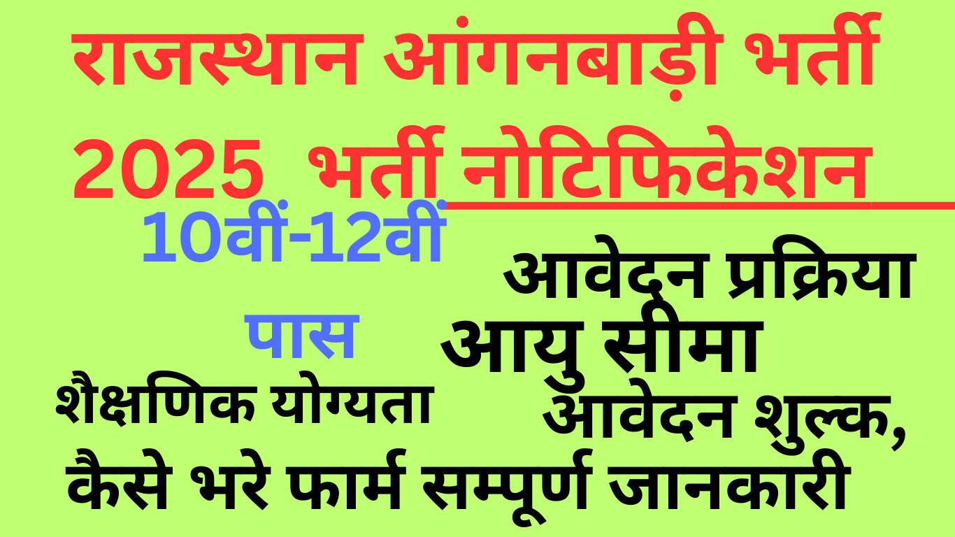 राजस्थान आंगनबाड़ी भर्ती 2025 (Rajasthan Anganwadi Recruitment 2025) का नोटिफिकेशन जारी कर दिया गया है। इस भर्ती के लिए 10वीं और 12वीं पास महिला अभ्यर्थी आवेदन कर सकती हैं। Rajasthan Anganwadi Bharti 2025 के तहत आवेदन प्रक्रिया पूरी तरह ऑफलाइन मोड में होगी। उम्मीदवारों को अपने जिले की आंगनबाड़ी कार्यालय से आवेदन पत्र प्राप्त कर निर्धारित तिथि तक जमा करना होगा। भर्ती का नोटिफिकेशन जिलेवार (District Wise) जारी किया जा रहा है, इसलिए आवेदन की अंतिम तिथि भी अलग-अलग तय की गई है।