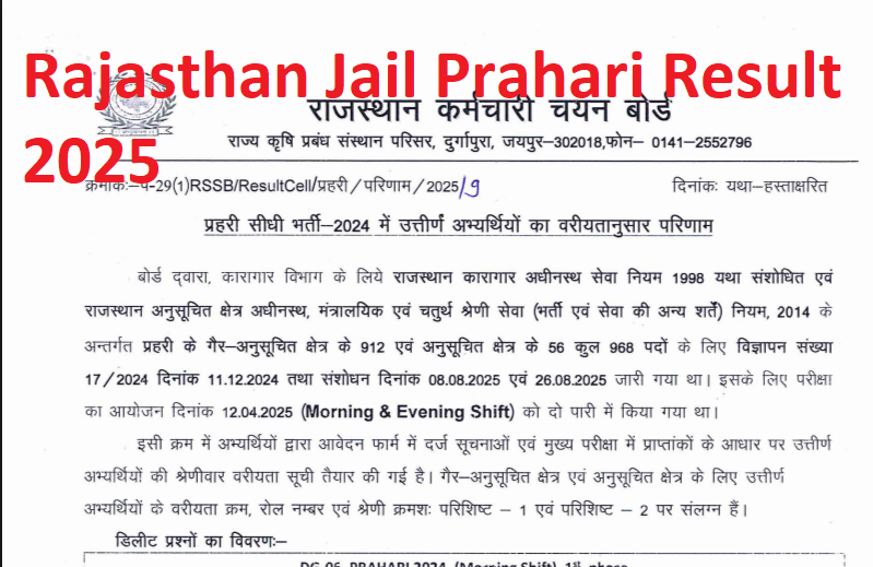 Rajasthan Jail Prahari Result 2025: राजस्थान कर्मचारी चयन बोर्ड (RSSB) द्वारा आयोजित जेल प्रहरी भर्ती परीक्षा 2025 का इंतजार कर रहे अभ्यर्थियों के लिए बड़ी खबर है। बोर्ड जल्द ही परीक्षा का रिजल्ट जारी करने वाला है। यह रिजल्ट 29 अगस्त 2025 को अपलोड होना था, लेकिन अत्यधिक ट्रैफिक के कारण वेबसाइट नहीं खुल पाई। अब बोर्ड ने साफ कर दिया है कि रिजल्ट 30 अगस्त 2025 को किसी भी समय जारी हो सकता है।