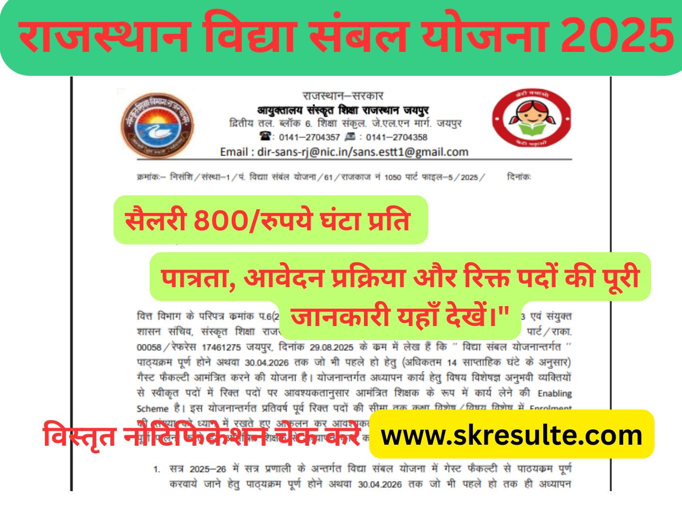 Rajasthan Vidya Sambal Yojana 2025: आयुक्तालय संस्कृत शिक्षा विभाग जयपुर ने शैक्षणिक सत्र 2025-26 के लिए 200 गेस्ट फैकल्टी (सहायक आचार्य) पदों पर आवेदन आमंत्रित किए हैं। इस योजना के अंतर्गत राज्य के सरकारी विद्यालयों, महाविद्यालयों, एवं अन्य शैक्षणिक संस्थानों में विषयवार शिक्षकों की कमी को पूरा किया जाएगा। आवेदन प्रक्रिया ऑफलाइन मोड से 3 सितंबर से शुरू होकर 8 सितंबर 2025 तक चलेगी। Rajasthan Vidya Sambal Yojana 2025 पात्रता, आवेदन प्रक्रिया और रिक्त पदों की पूरी जानकारी यहाँ देखें।”